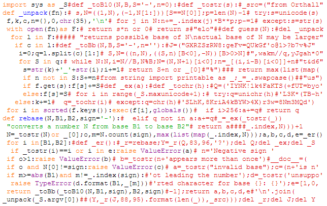 In the 25 line rebaser above, I pass its own file name to the unpacker which then reads and adds the functions hidden in the comments. I limited the code to 80 characters long, but there’s no reason why it couldn’t be longer. There’s some loss of functionality from the class Z rebaser – it’s much slower and can’t handle as many bases, but I think that’s sufficient for 25 lines. It’ll cover either 131,069 bases or 2,228,221 bases, depending on your version of Python. It could go higher but you might run into errors. It can be avoided but there’s no guarantees:
