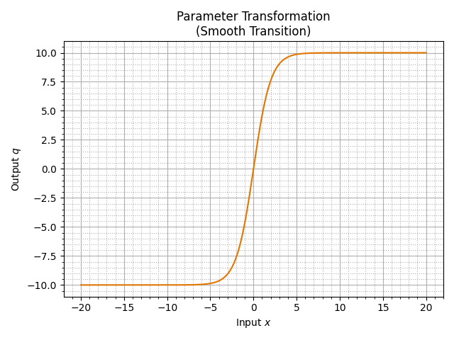 As x heads off to infinity in either direction, this transforms it to be closer and closer to the bounds you’ve placed on it, which might be what you need for your specific case; or you just like things to be smooth. Although it does have a quirk which might not be helpful – the transition between the bounds seems to happen to x being within ±5, so I might have to look into this again, but it’s fine for now.